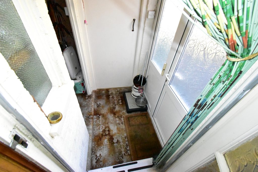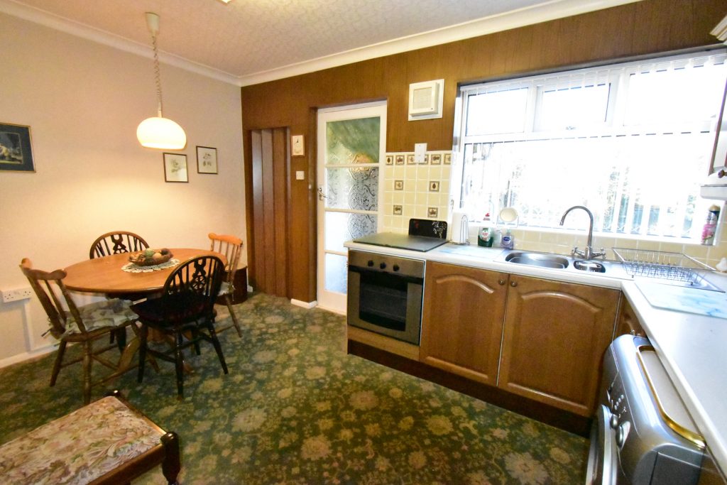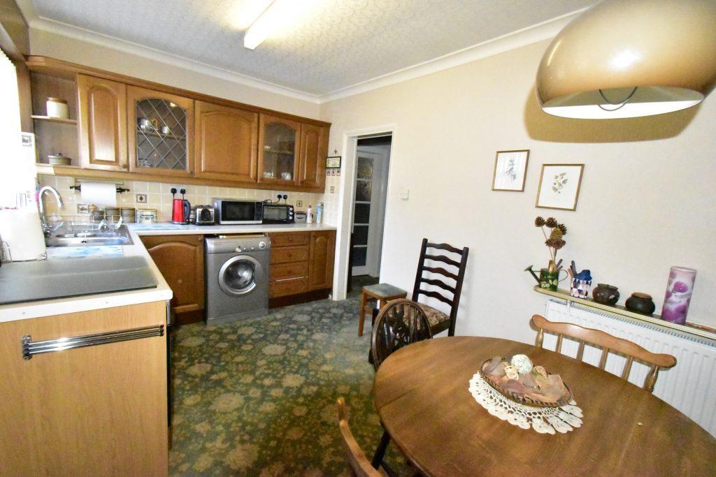 With a range of wall and base units in a dark wood finish with coordinating work surfaces, part wall tiling, integrated oven, four ring hob, space and plumbing for a washing machine, space and plumbing for a fridge freezer, integrated storage cupboard, one and a half bowl single drainer sink with mixer tap, window to the rear, door to porch, radiator, power and ceiling light points.