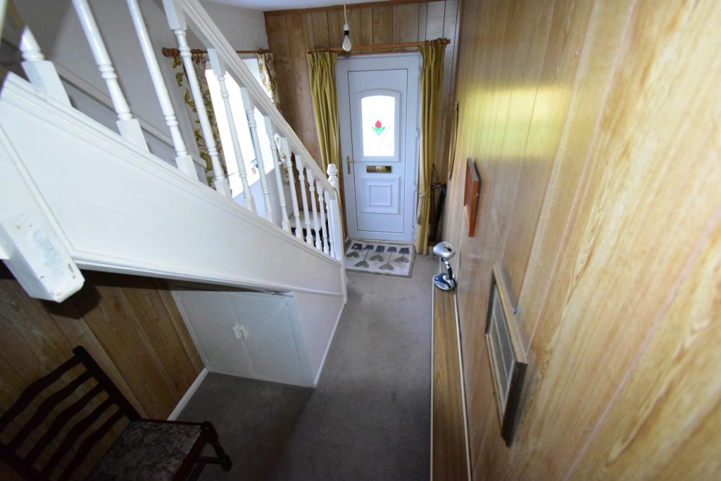 With window to the side, stairs to the first floor landing, radiator and ceiling light point.