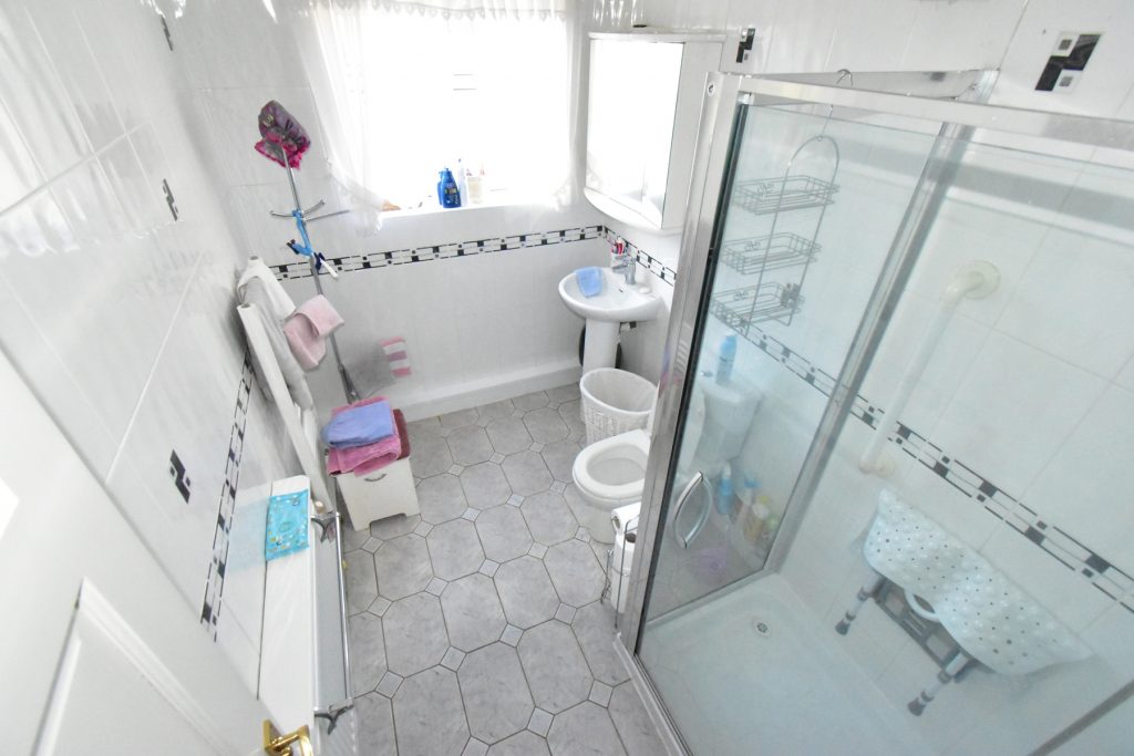 With opaque window to the rear, W.C., wash hand basin, shower cubicle, towel radiator, fully tiled walls, radiator and ceiling light point.