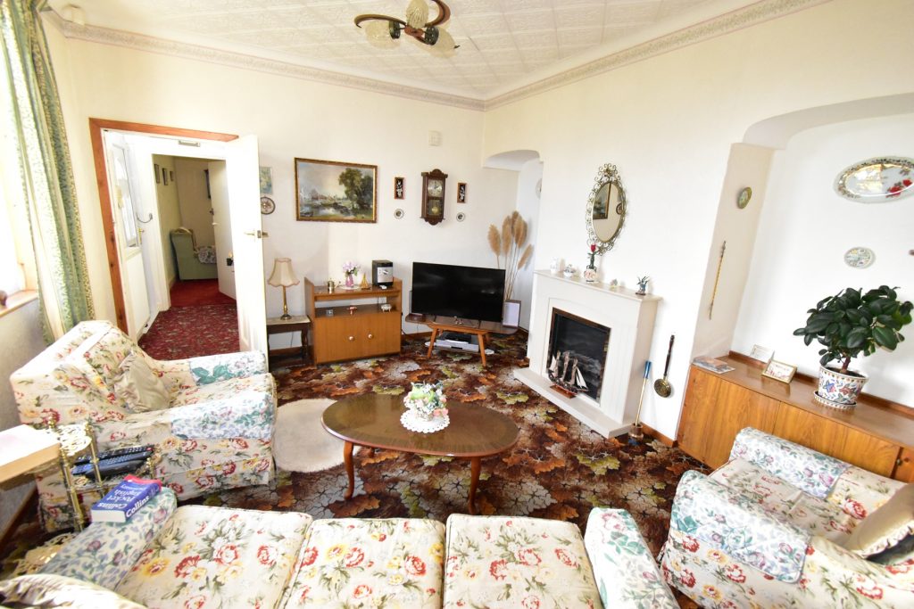 With a window to the side of the property, feature fireplace, doors through to the kitchen, radiator, power and ceiling light points.