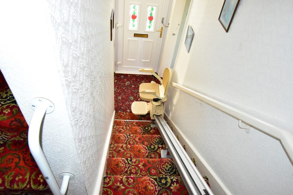 With stairs to the first floor landing, doors to the living room and lounge/dining room and a ceiling light point.