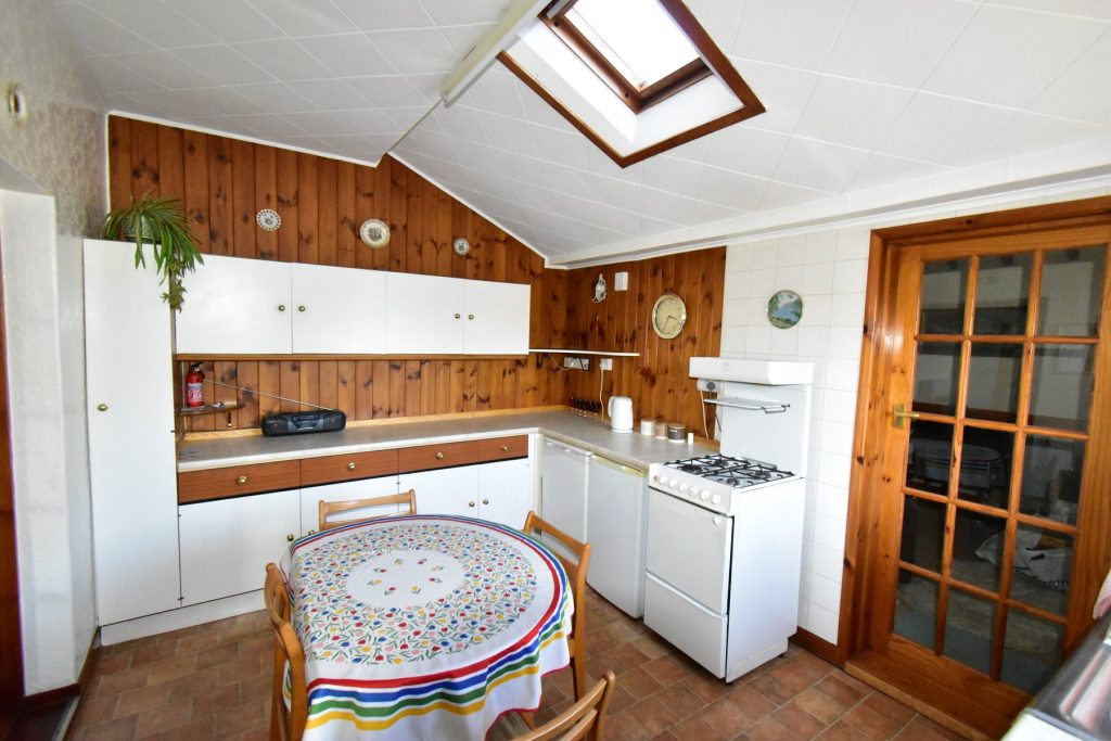 Fitted with a range of wall and base units in a white finish with coordinating work surfaces, park tiled walls, sink, space and plumbing for fridge/freezer, space and plumbing for oven, window, velux window, power and ceiling light points.