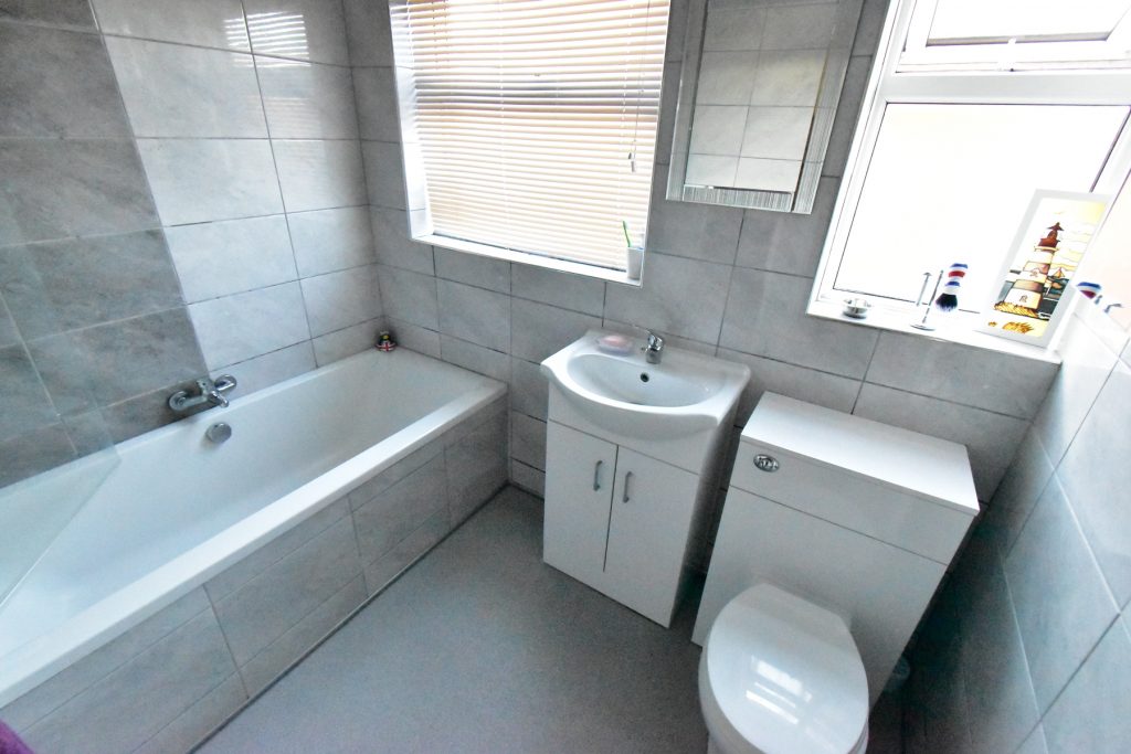 The bathroom has a three piece white suite comprising of a panelled bath with electric shower over, a wah hand basin set into vanity unit, W.C. with integrated flush, two double glazed windows to the side full wall tiling a towel rail, radiator and ceiling spotlights.