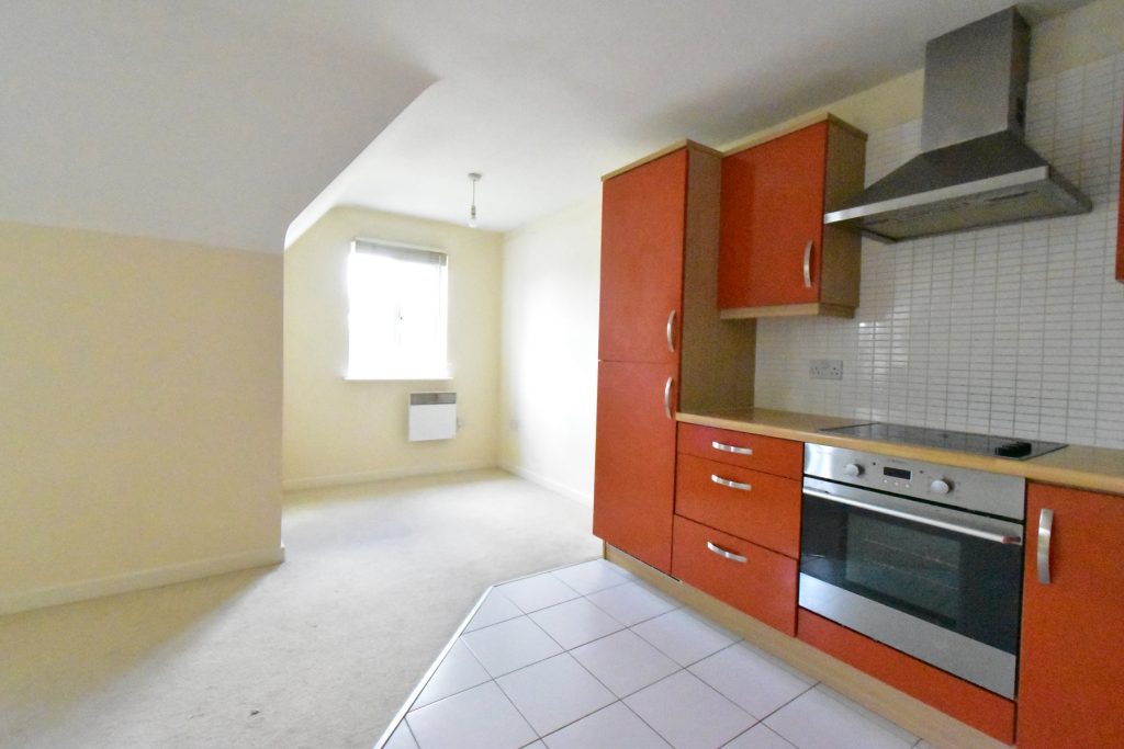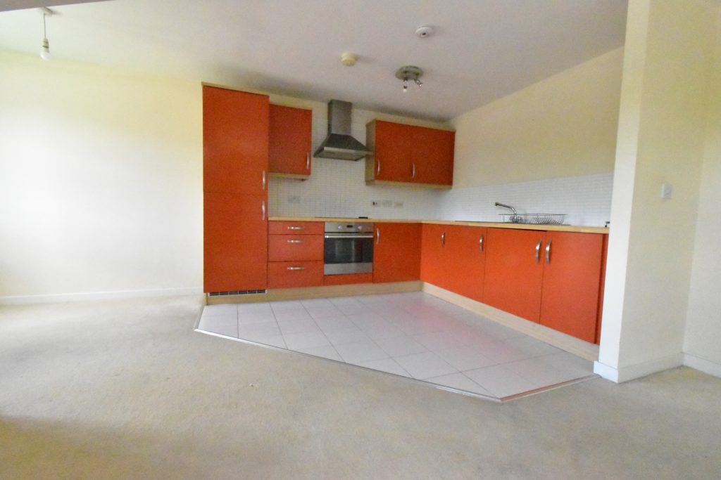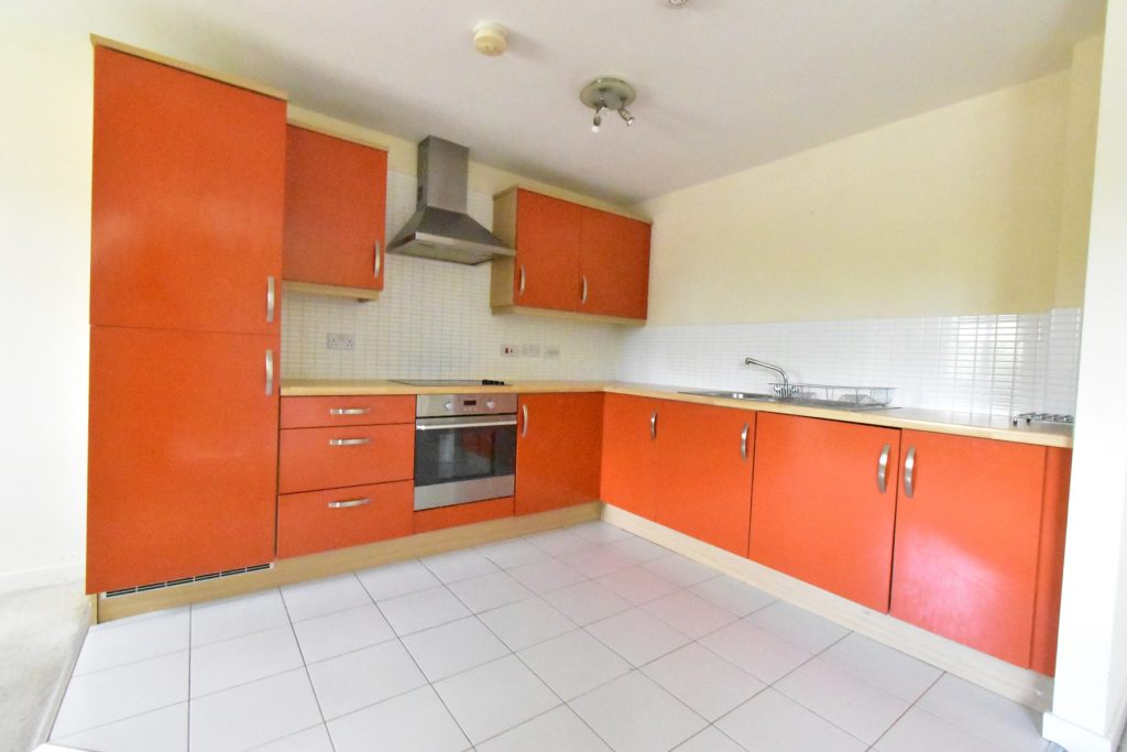 With a range of wall and base units in an orange finish with coordinating work surfaces, part wall tiling, integrated electric oven, integrated four ring electric hob, single drainer stainless steel sink with mixer taps, stainless steel extractor fan, integrated fridge, integrated freezer, integrated washer/dryer, power and ceiling light points.