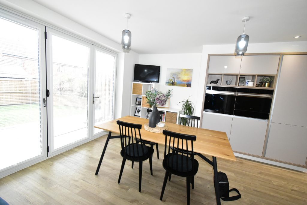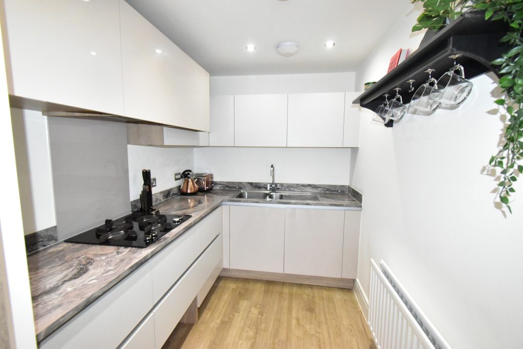 With a range of wall and base units in a white finish with coordinating work surfaces, one and a half bowl stainless steel sink with mixer tap, integrated double ovens, integrated electric hob, extractor fan, integrated fridge freezer, UPVC double glazed patio doors into the garden, ceiling spotlights, radiator, power points and ceiling light points.
