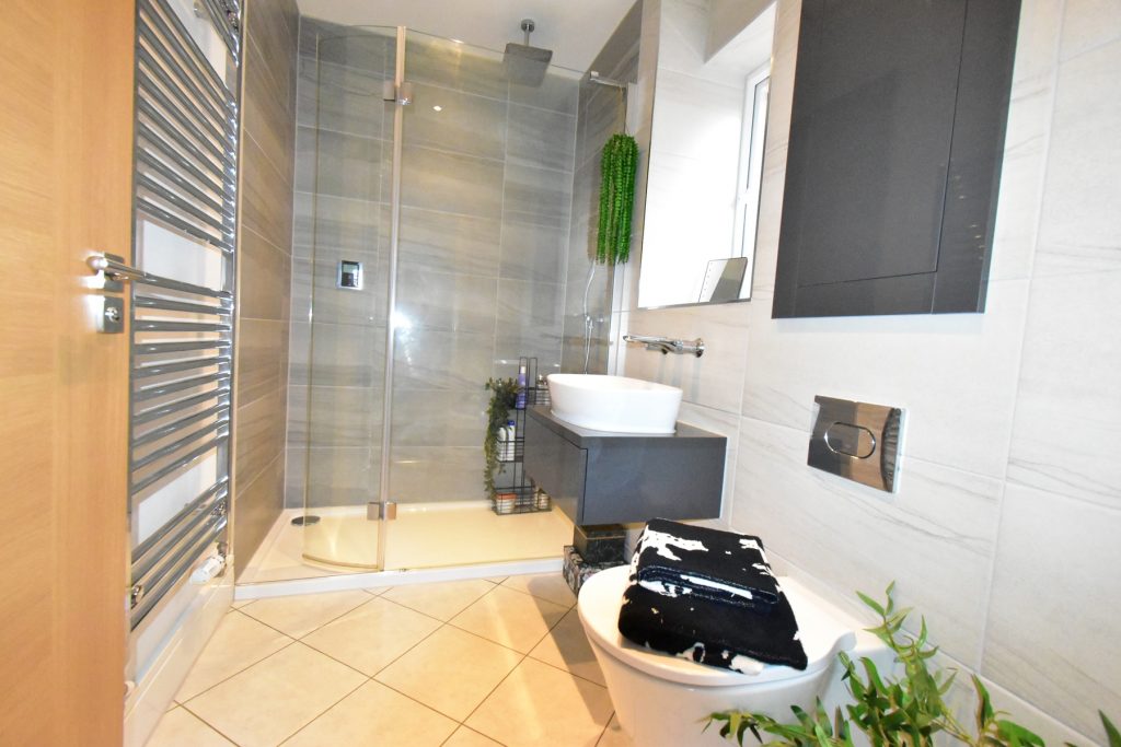 With UPVC double glazed window to the side, W.C, wash hand basin, shower cubicle, tiled walls, chrome towel radiator and ceiling spotlights.