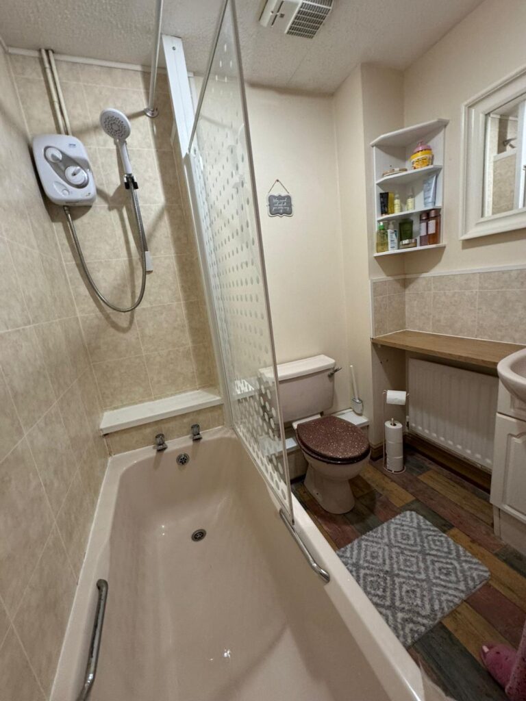 White three piece suite comprising of a wash hand basin built into vanity, W.C. and bath with shower over, part tiled walls, radiator and ceiling light point.