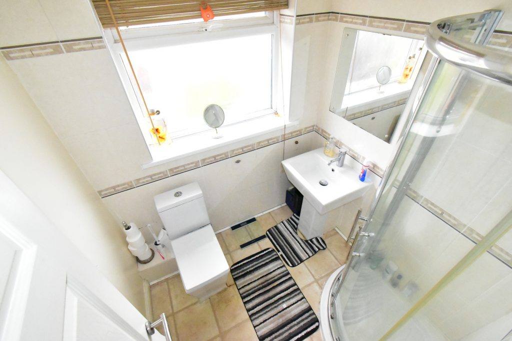 Double glazed opaque window to the side of the property, white three piece suite comprising of a wash hand basin, W.C. and a shower cubicle, fully tiled walls, radiator and ceiling light point.