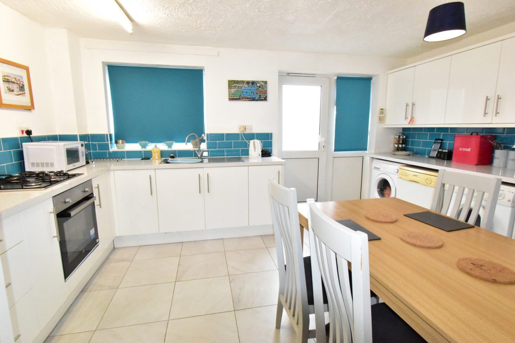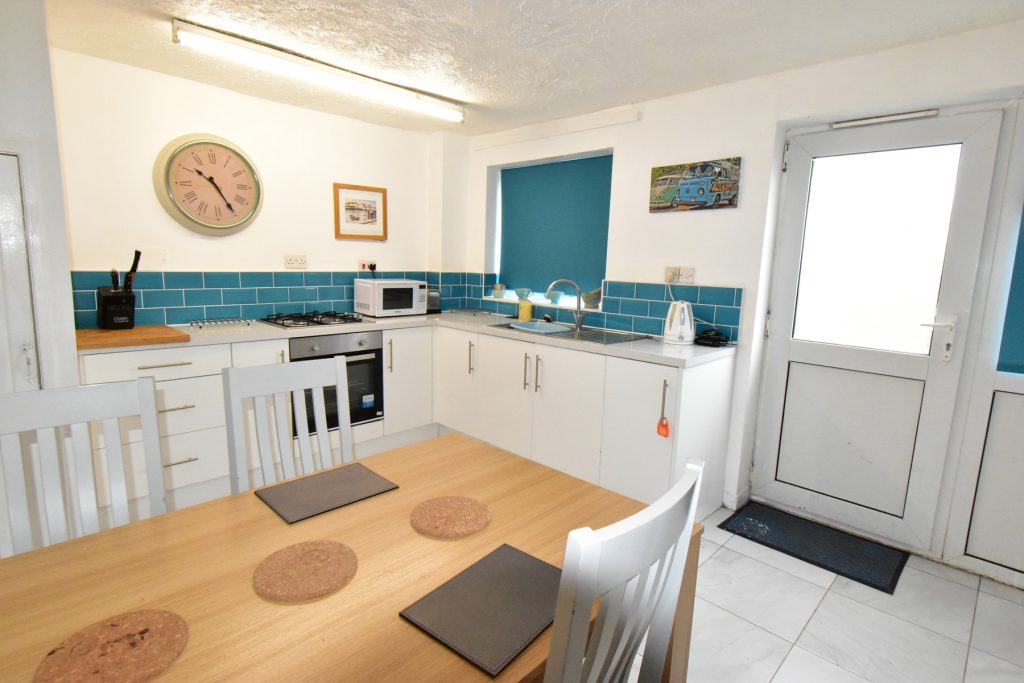 Fitted with a range of wall and base units in a white finish with coordinating work surfaces, part wall tiling, space and plumbing for a fridge/freezer, space and plumbing for a washing machine, integrated oven, four ring gas hob, single drainer sink with mixer tap window to the rear, door to the rear, radiator, power and ceiling light points.