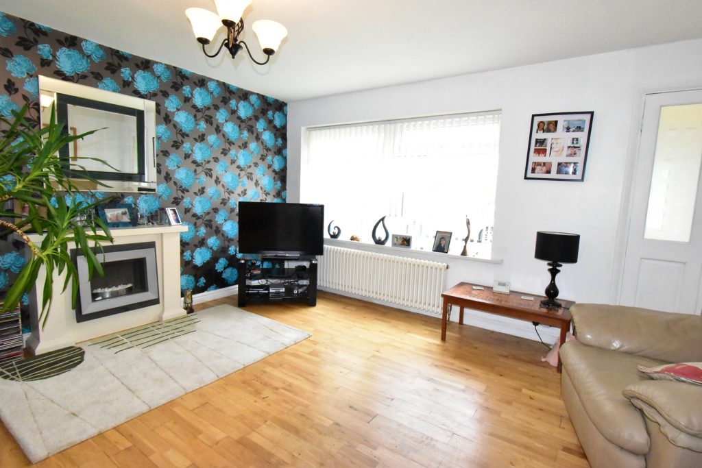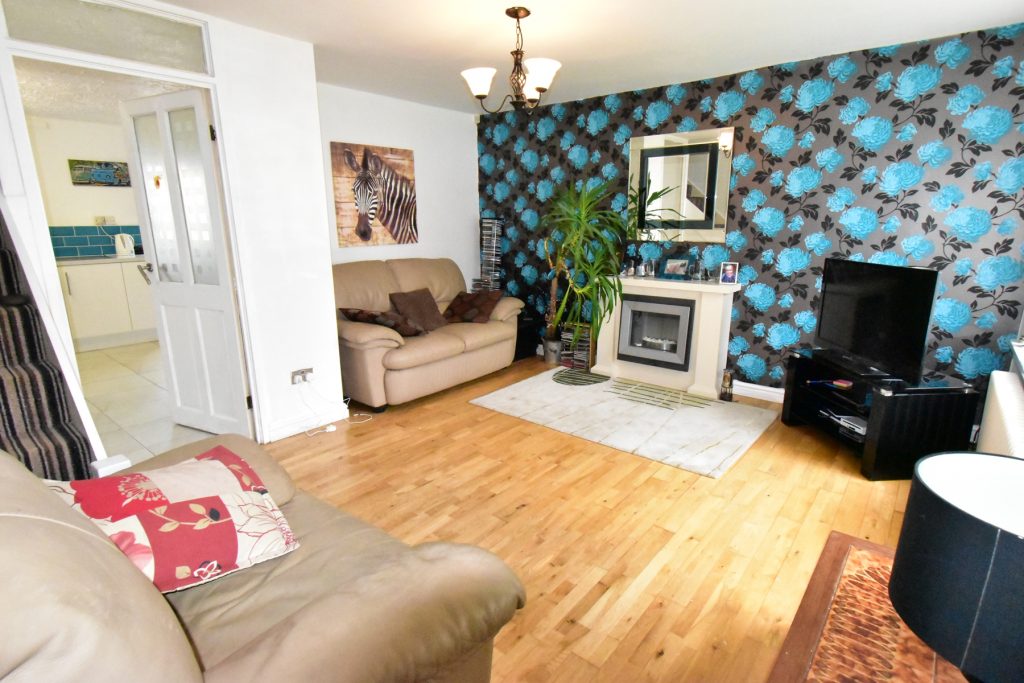 A spacious family room with double glazed window to the front, feature fireplace, stairs to the first floor landing, radiator, power and ceiling light points.