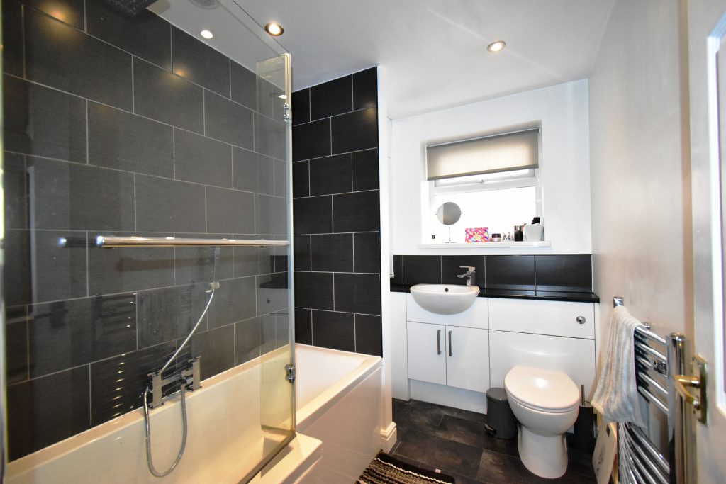 With three-piece modern white suite comprising close coupled W.C and wash hand basin with mixer tap set into vanity unit, D-Shaped panelled bath with shower over and glazed shower screen, towel rail radiator, part wall tiling, ceiling light point and UPVC double glazed opaque window to the side.