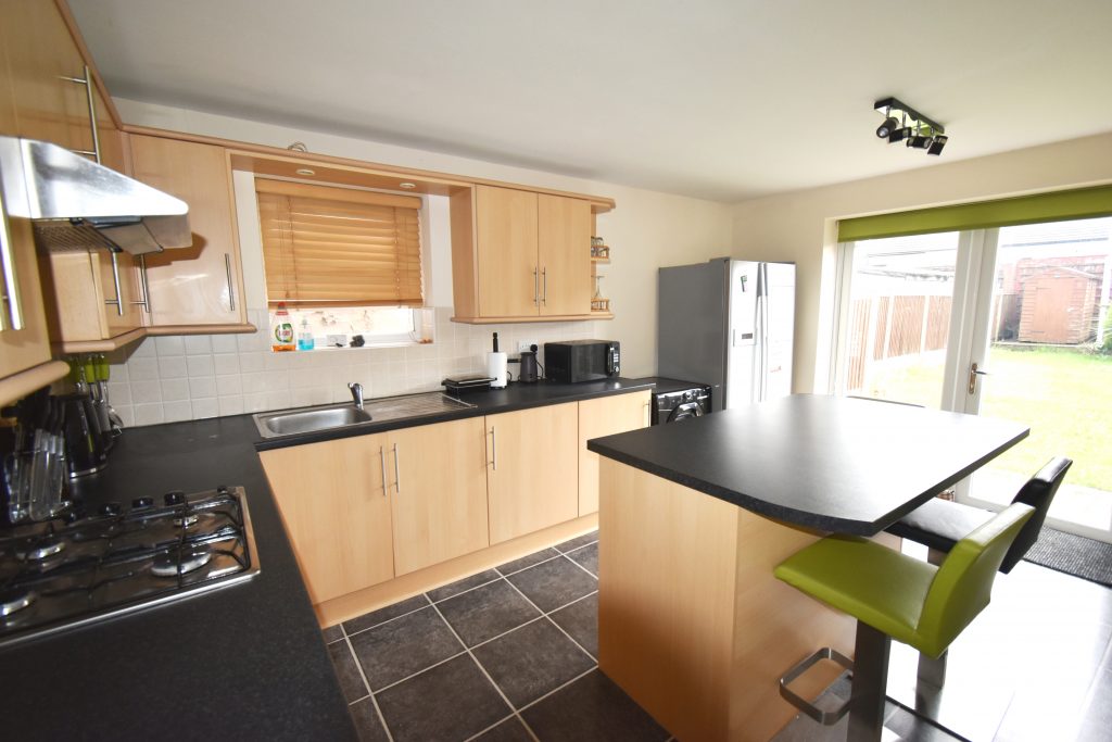 This modern dining kitchen offers a range of matching wall and base units offering plenty of storage with roll top work surfaces and coordinated tiled splashback along with a central island offering breakfast bar style seating and further cupboard space. There is stainless steel sink with mixer tap, extractor fan over gas hob and electric oven, space for fridge freezer, space and plumbing for washing machine, tiled floor, power points, ceiling spot lights, radiator, UPVC double glazed window to the side and the benefit of patio doors to rear garden; perfect for outside dining in the summer months.