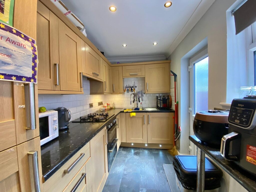 Fitted with a range of wall and base units in a wood effect finish with coordinating roll top work surfaces, part wall tiling, integrated washing machine, integrated fridge freezer, integrated oven, four ring gas hob, one and a half bowl single drainer sink with mixer tap, UPVC double glazed window to the rear, door to the rear, radiator, power and ceiling light points.