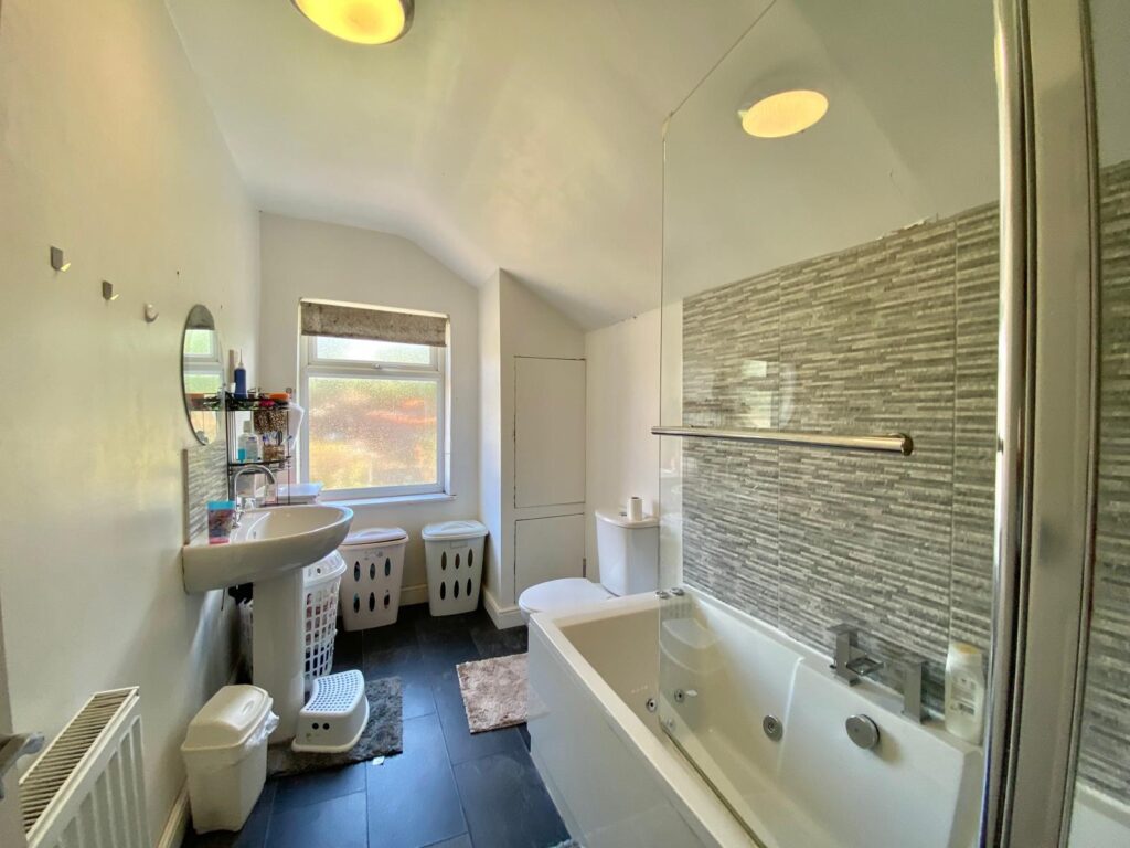 White three piece suite comprising of a wash hand basin, W.C. and bath with shower over, part tiled walls, UPVC double glazed opaque window to the rear, radiator and ceiling light point.