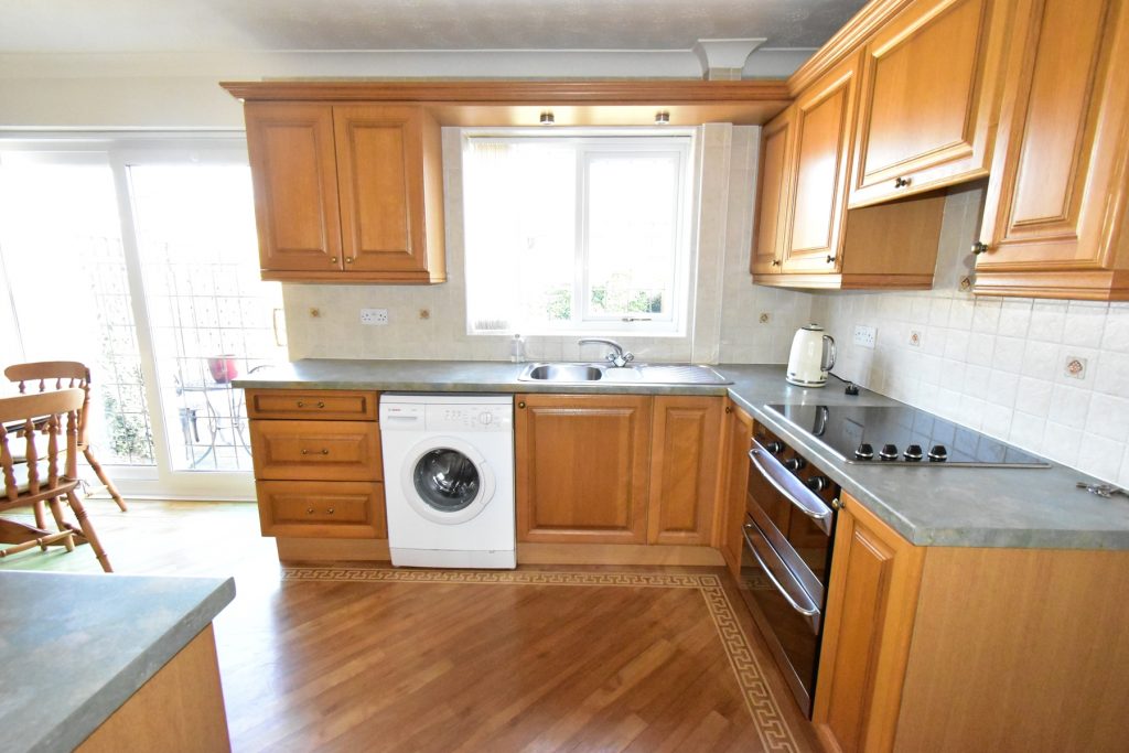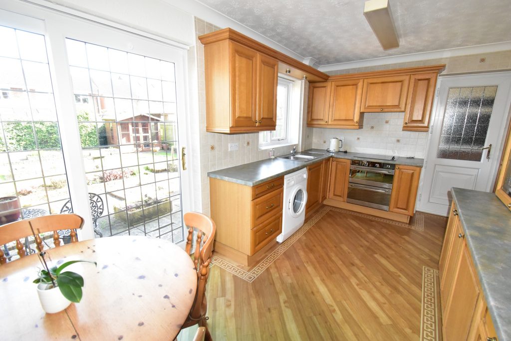Fitted with a range of wall and base units in a wood finish with coordinating work surfaces, part wall tiling, integrated oven, integrated four ring electric hob, extractor fan, stainless steel sink with mixer tap, space and plumbing for a washing machine, window to the rear, patio doors to the garden, radiator, power and ceiling light points.