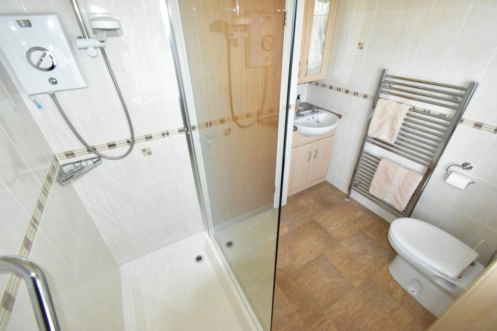 With opaque window, W.C., wash hand basin, shower cubicle, tiled walls, chrome towel radiator and ceiling light points.