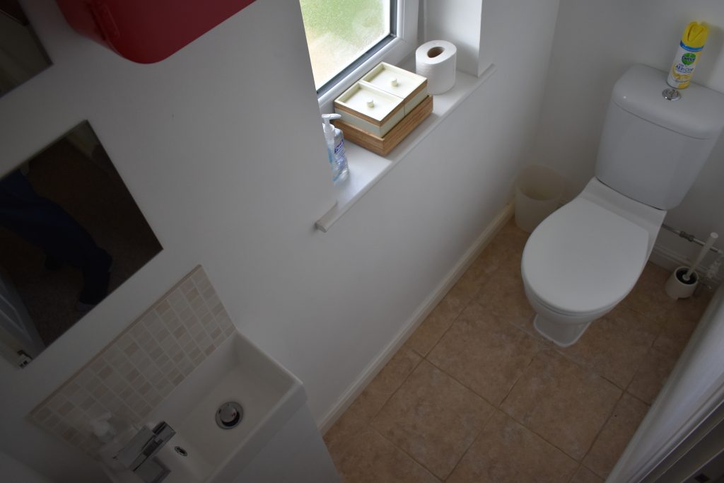 With wash hand basin set into vanity unit, closed coupled W.C, UPVC double glazed opaque window to the front, thermostatically controlled radiator, ceiling light point and ceramic floor tiling.