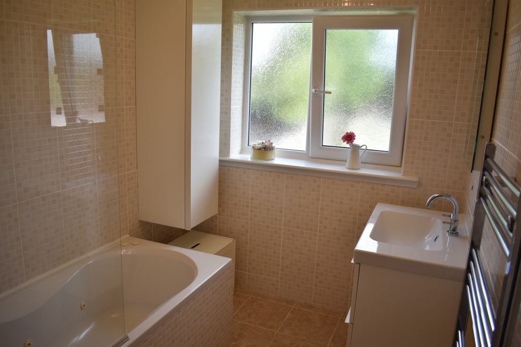 With wash hand basin set into vanity unit, spa bath with shower head mixer taps, UPVC double glazed opaque window to the rear, floor tiling, wall tiling, thermostatically chrome towel rail radiator, ceiling light point and extractor.