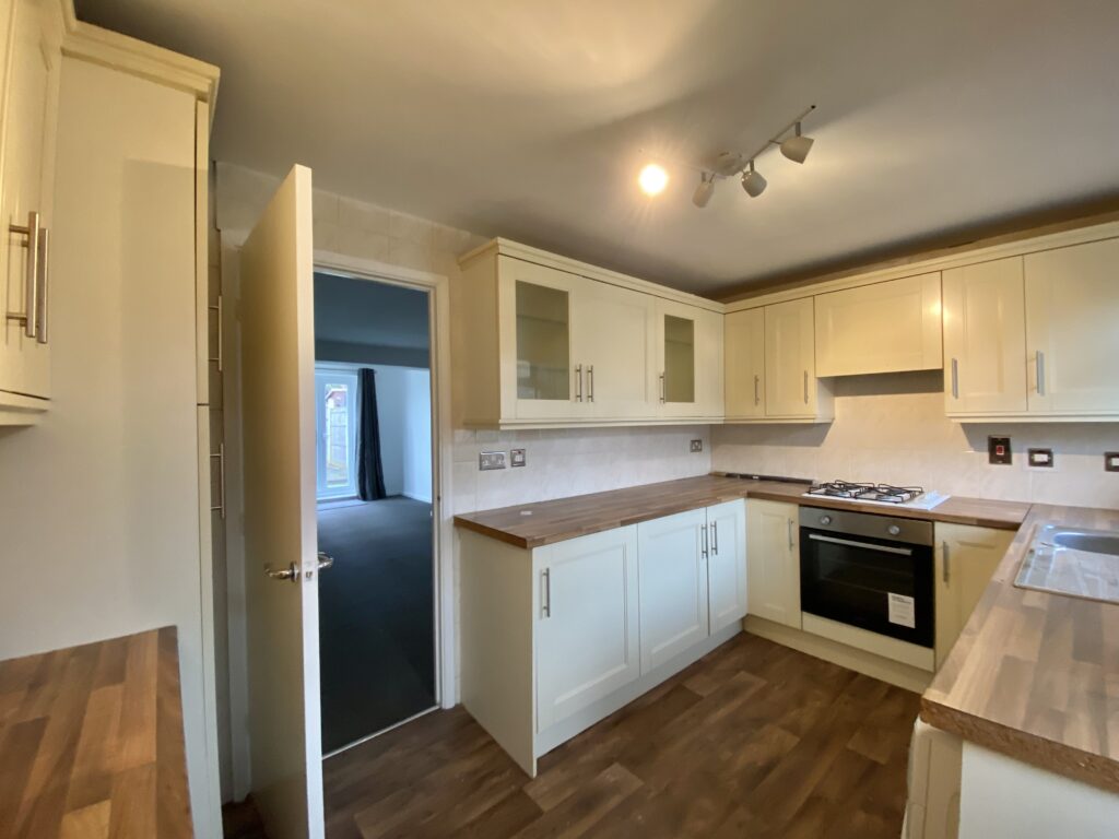 Fitted with a range of wall and base units in a white finish with coordinating roll top work surfaces, part wall tiling, space and plumbing for a washing machine, space and plumbing for a fridge freezer, integrated oven, four ring gas hob, extractor fan, single drainer sink with mixer tap, UPVC double glazed window to the front, radiator, power and ceiling light points.