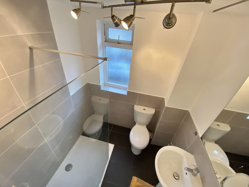 UPVC double glazed opaque window to the rear, white suite comprising of a wash hand basin, W.C. and shower cubicle, part tiled walls, radiator and ceiling light pint.