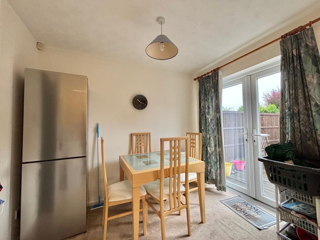 Fitted with a range of wall and base units in a grey finish with coordinating work surfaces, part wall tiling, space and plumbing for a washing machine, space and plumbing for a fridge freezer, integrated oven, four ring gas hob, extractor fan, one and a half bowl single drainer sink with mixer tap, UPVC double glazed window to the rear, UPVC patio doors too the rear, radiator, power and ceiling light points.