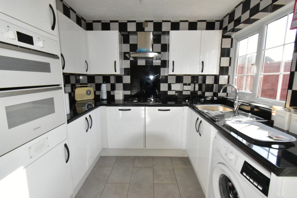 Fitted with a range of wall and base units in a white finish with coordinating work surfaces, full wall tiling, space and plumbing for a washing machine, space and plumbing for a fridge freezer, integrated oven, four ring gas hob, single drainer sink with mixer tap, UPVC double glazed window to the rear, radiator, power and ceiling light points.
