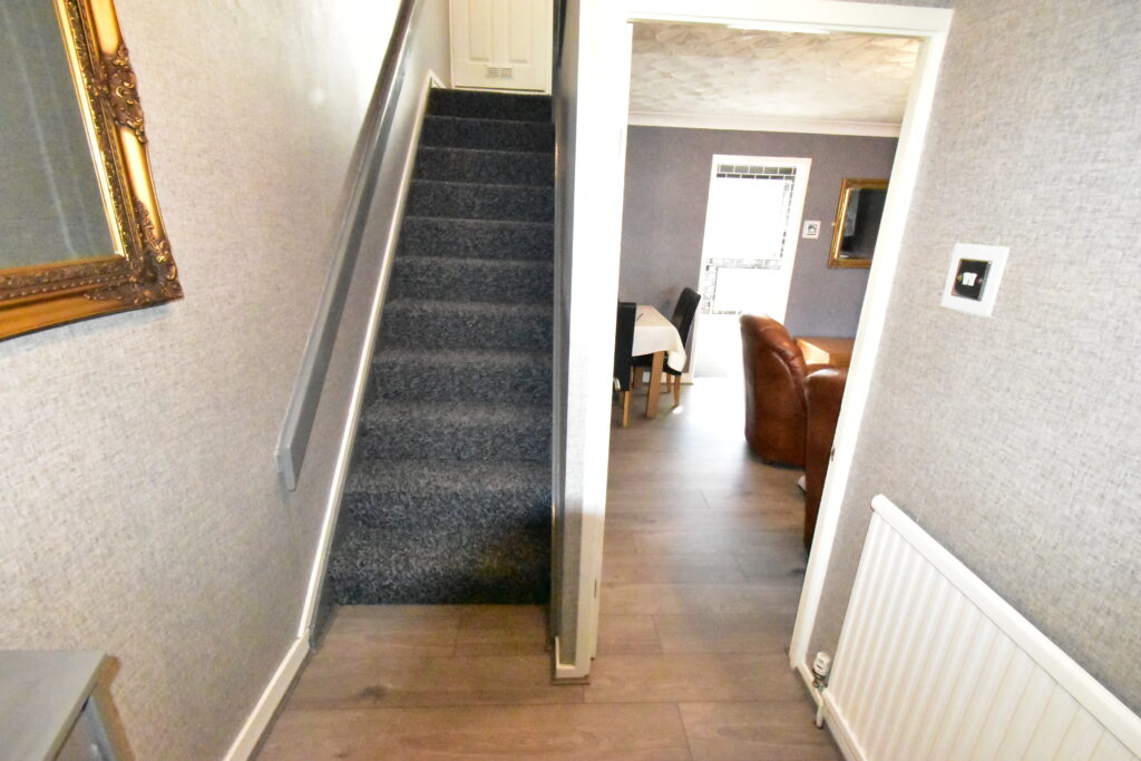 With stairs to the first floor landing, access to the living room, radiator, and ceiling light points.