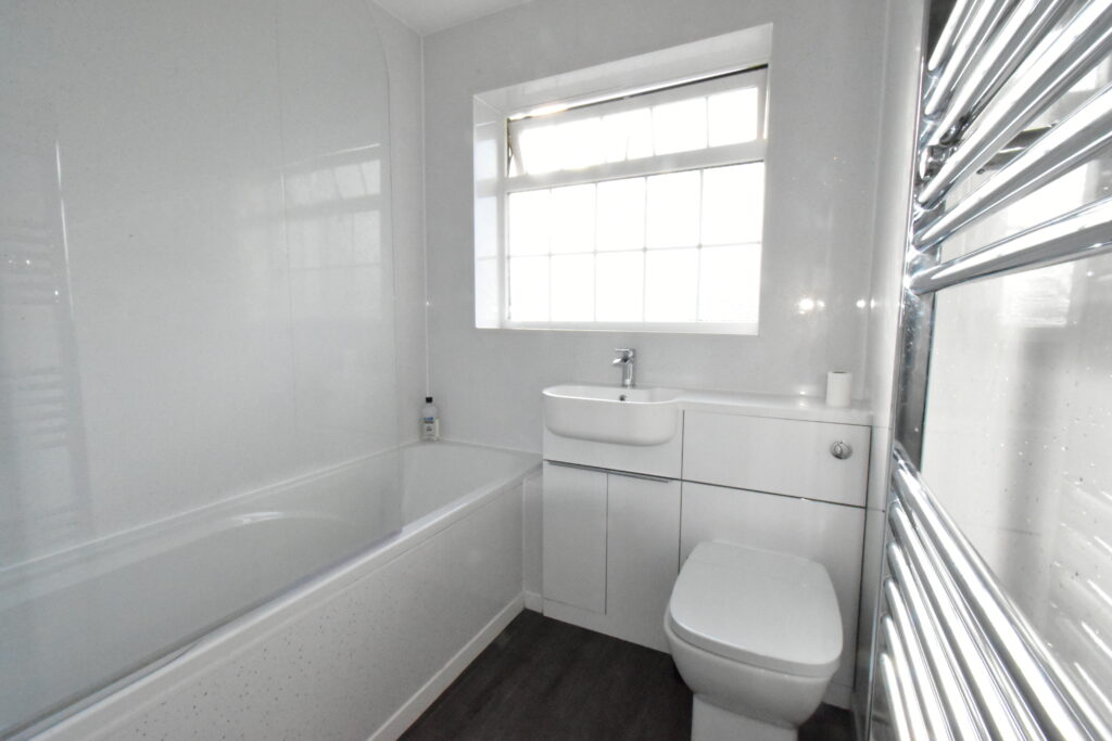 White three piece suite comprising of a wash hand basin built into vanity, W.C. and bath with shower over, part wall tiling, UPVC double glazed opaque window to the rear, radiator and ceiling light point.