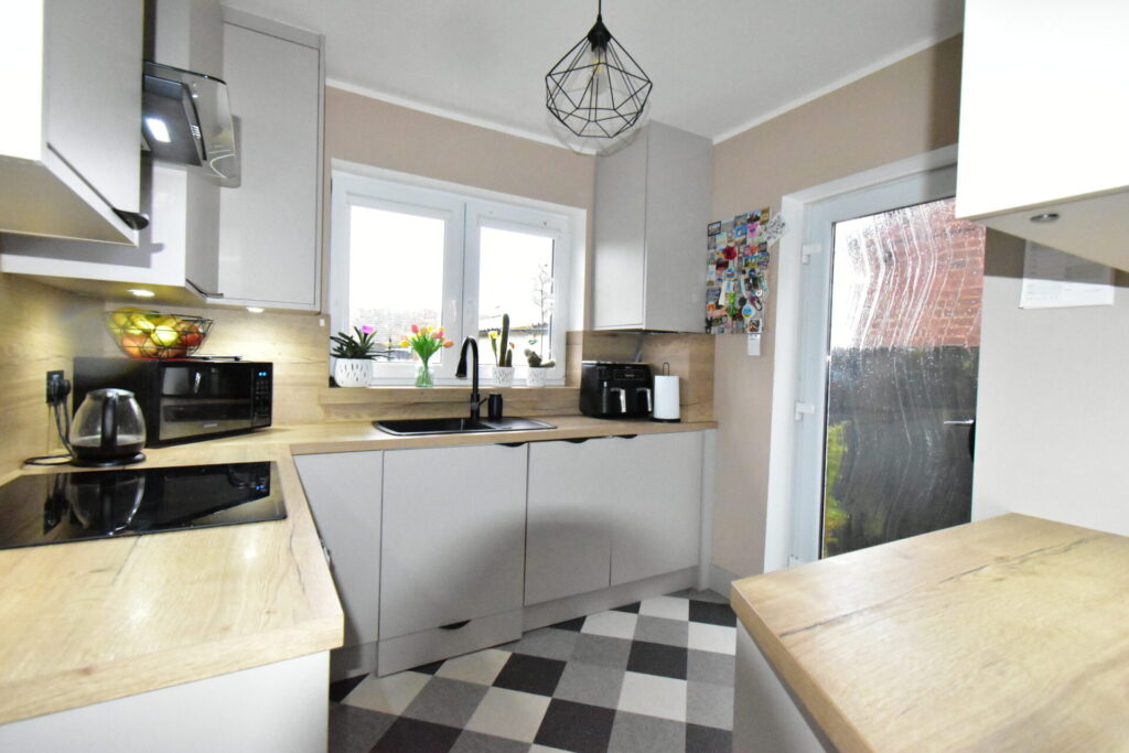 Fitted with a range of wall and base units in a grey finish with coordinating wooden top work surfaces, integrated washing machine, integrated fridge freezer, integrated oven, four ring electric hob, extractor fan, single drainer sink with mixer tap, UPVC double glazed window to front elevation, door to the side elevation, power and ceiling light points.