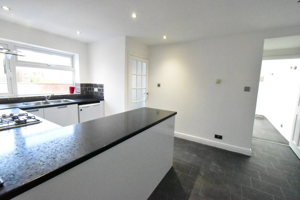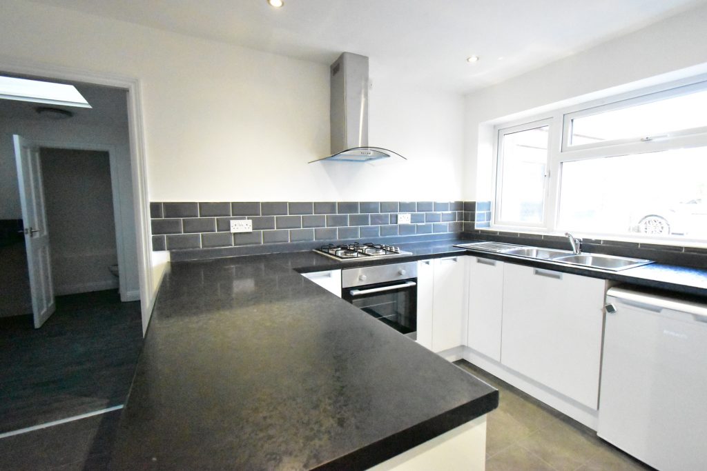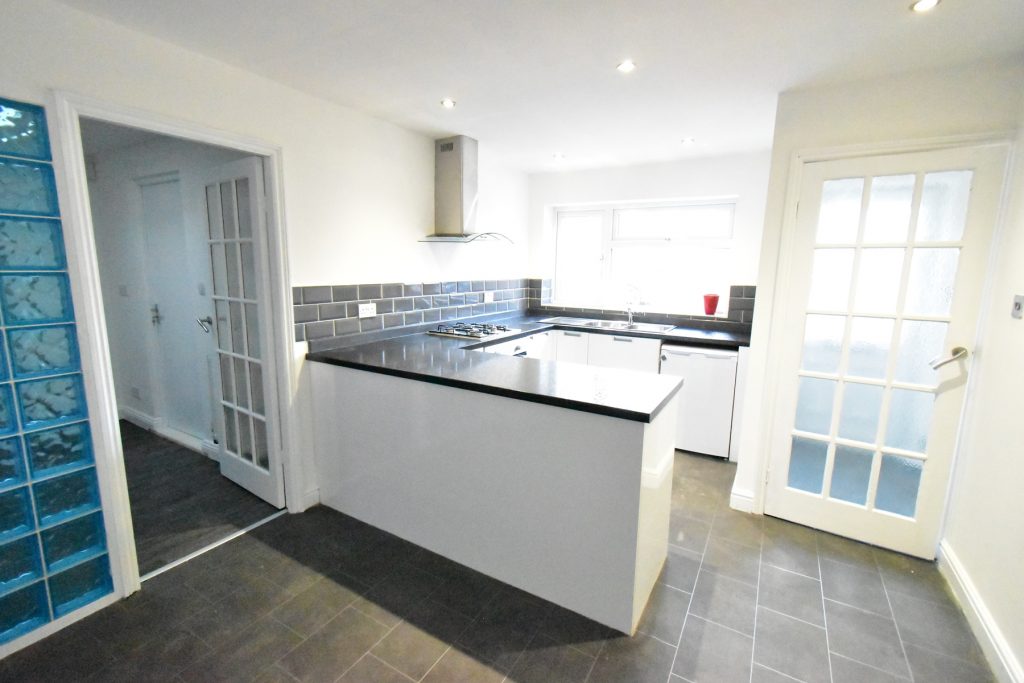 With a range of base units in a white gloss finish, integrated oven, 4 ring stainless steel gas hob with extractor fan over, double stainless steel sink with mixer tap, space for a fridge freezer, part tiled walls, tiled floor, power and ceiling light points.