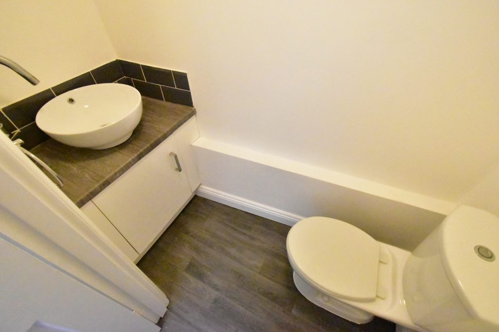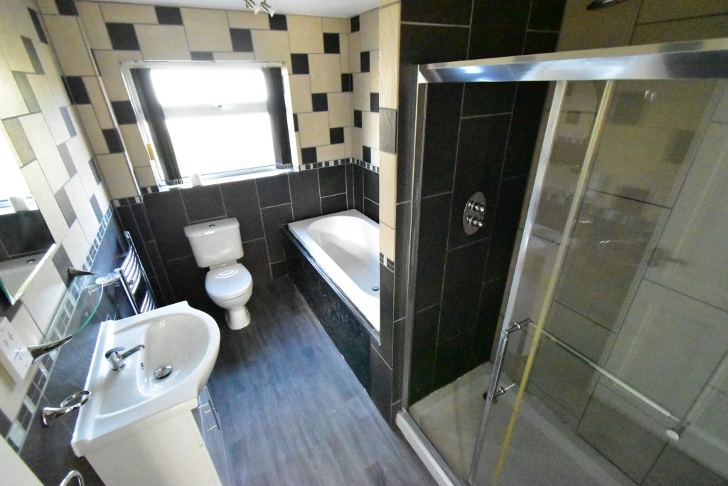 Window to the side, 3 piece suit comprising of a toilet, panelled bath and sink built into vanity unit, separate shower cubicle with sliding glass doors, chrome towel radiator, ceiling light point.