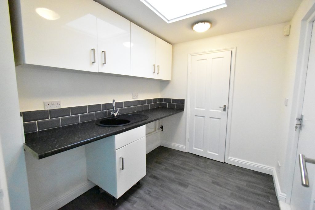 With a range of wall and base units and work surfaces coordinating with the kitchen, sink with mixer tap, part tiled wall, space and plumbing for washing machine, window to the roof, door to downstairs W.C, power and ceiling light points,
