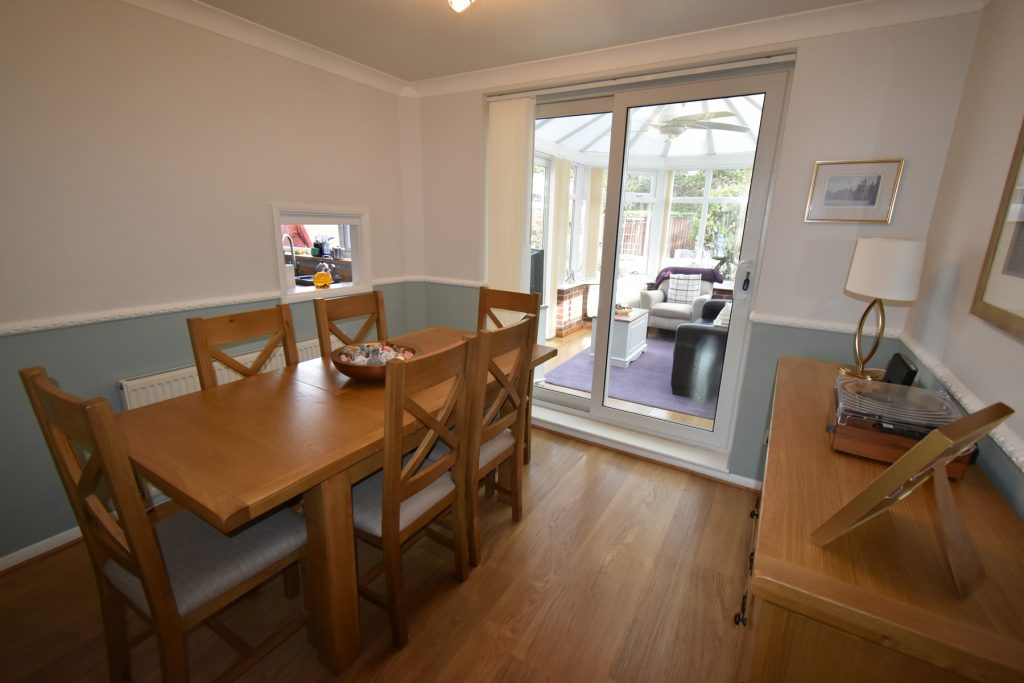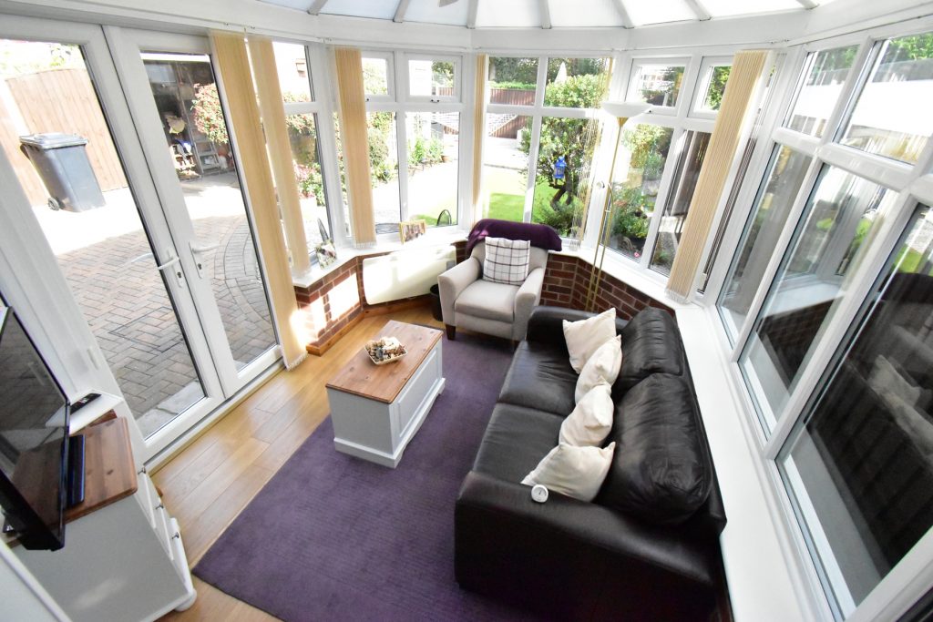 With a pitched ceiling the conservatory has ceiling fan light, wall mounted electrical radiator, laminate flooring. Power, TV aerial and ceiling light points. French doors opening on to the rear garden.
