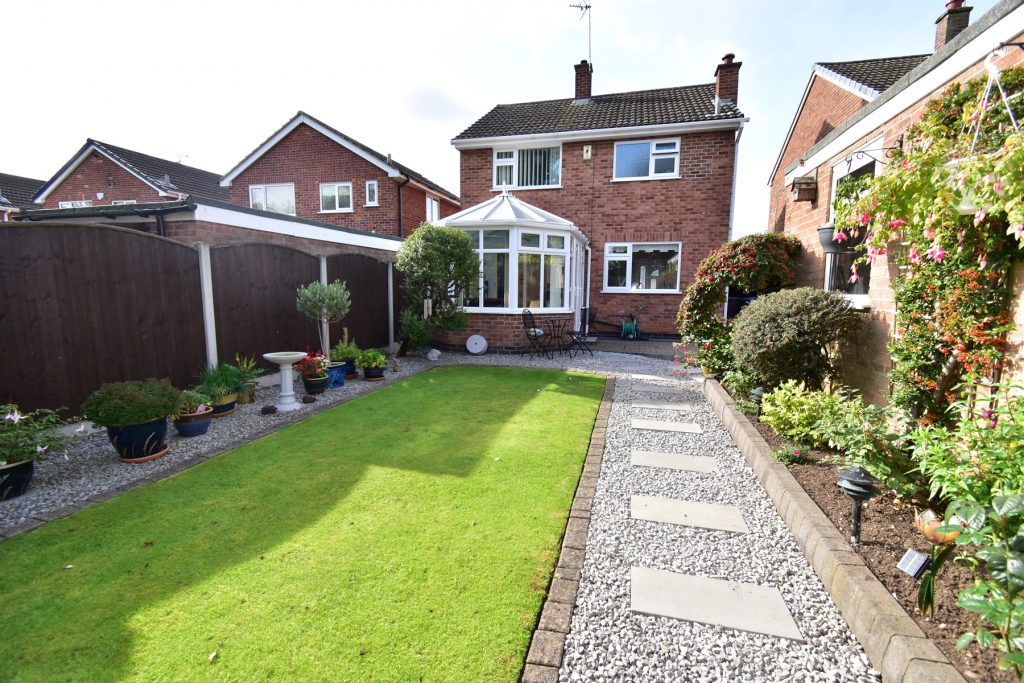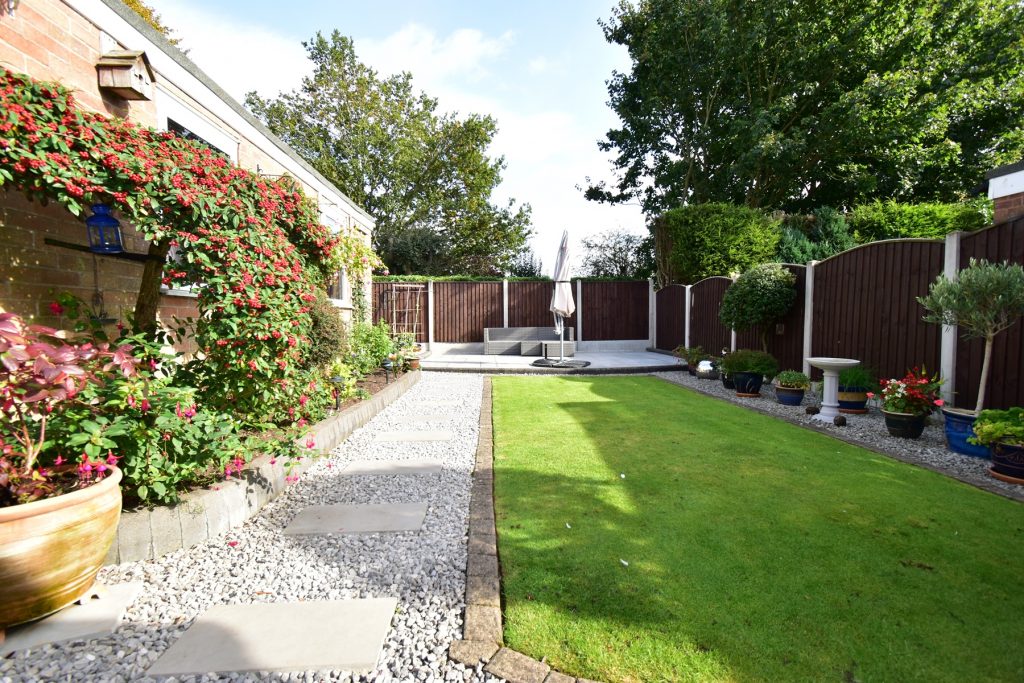 Outside is a beautiful enclosed garden with a grassed area, planted boarders and a stone pathway down to a patio area at the bottom of the garden. There is a full size garage with an up and over door, perfect for storage.