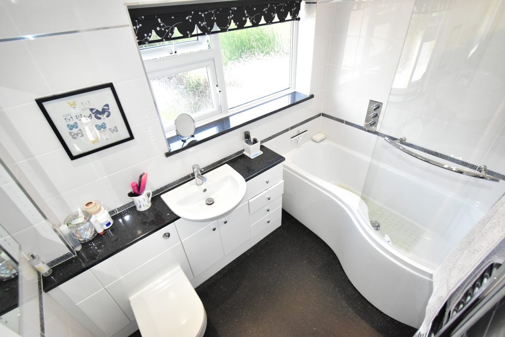 The refitted bathroom has full wall tiling and a pea shaped bath with monsoon and separate shower head. There are wall mounted taps, chrome towel rail radiator, wash hand basin set into vanity unit, W.C with soft close lid and integrated cistern. There is a UPVC double glazed opaque window to the rear and ceiling spotlights.