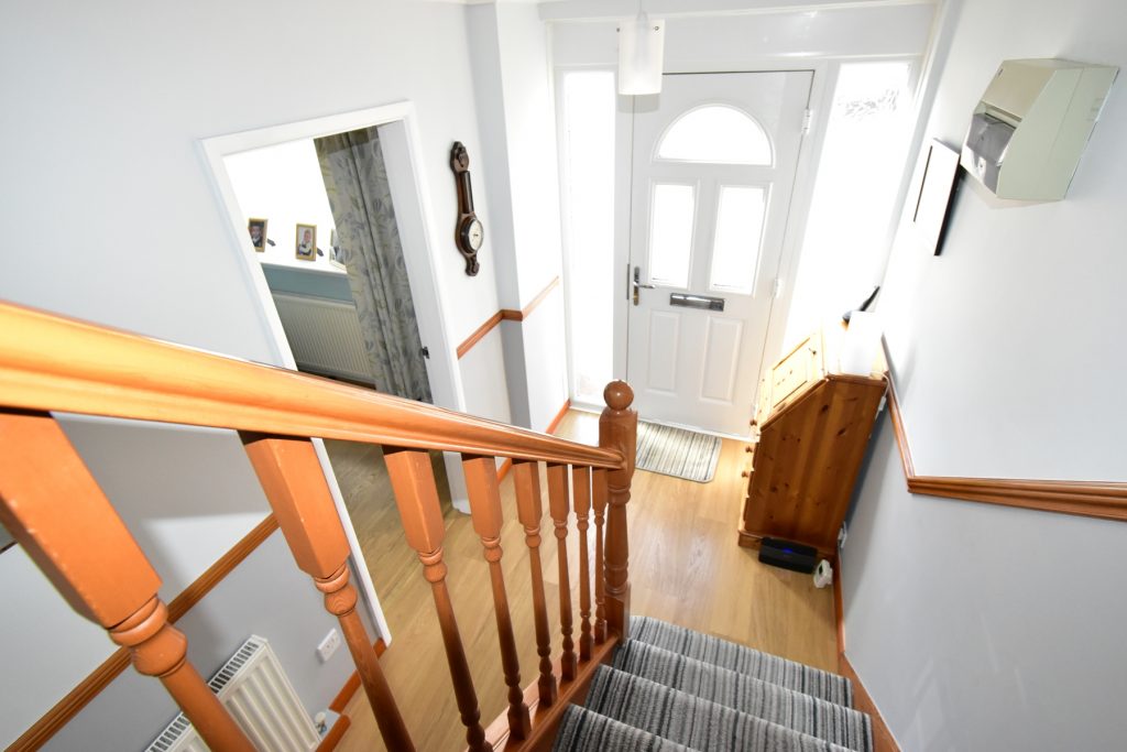 With stairs to first floor landing, radiator, power point, ceiling light point, smoke alarm, telephone point, ceiling coving and laminate flooring.