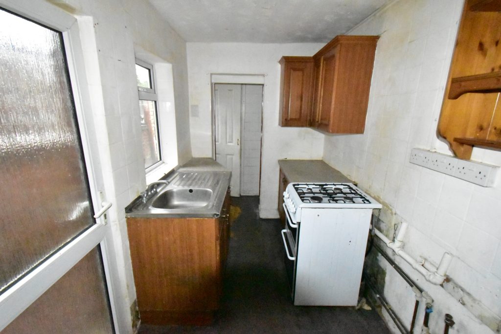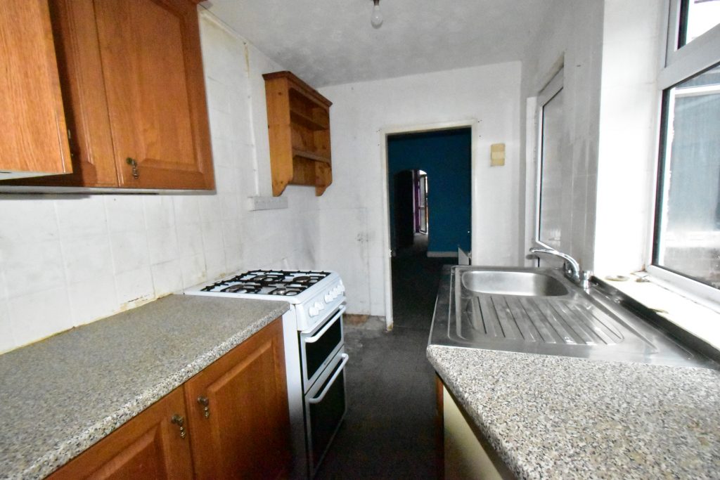 With a range of fitted wall and base units, single drainer stainless steel sink with mixer tap, cooker, plumbing for washing machine, space for fridge/freezer, laminate flooring, UPVC double glazed window and door to the side.