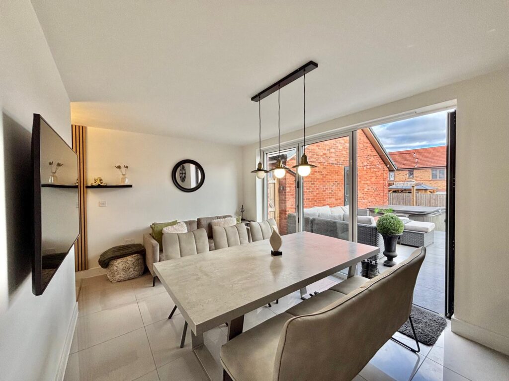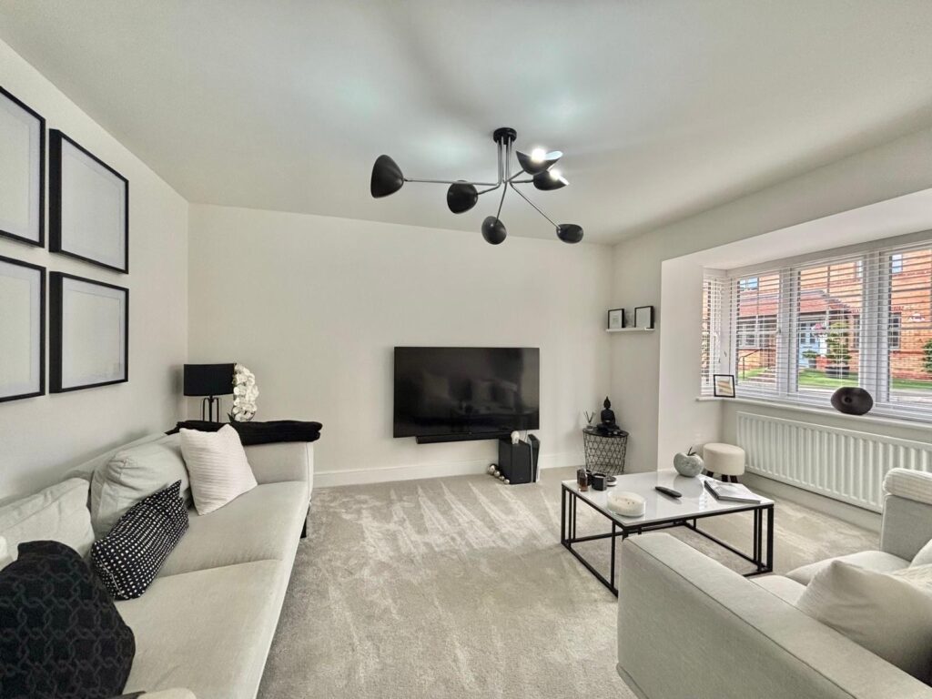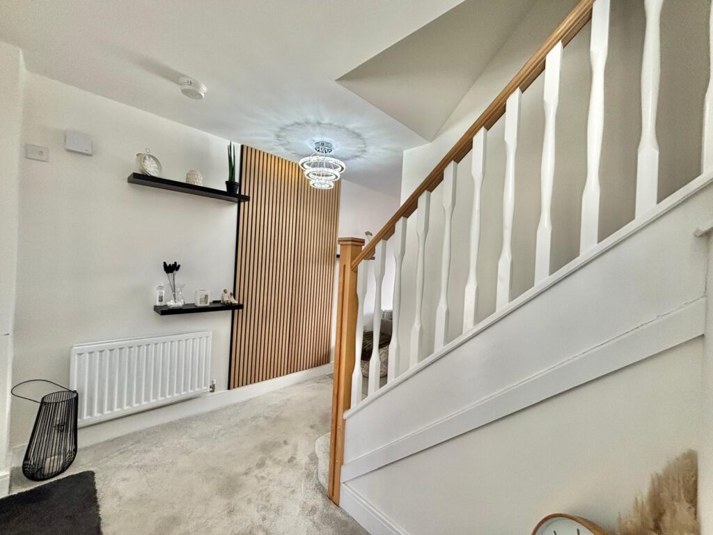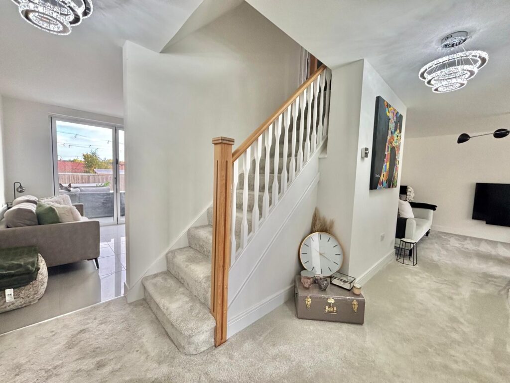 A spacious family room with UPVC double glazed window to the front, stairs to the first floor landing, access to the dining kitchen, radiator, power and ceiling light points.