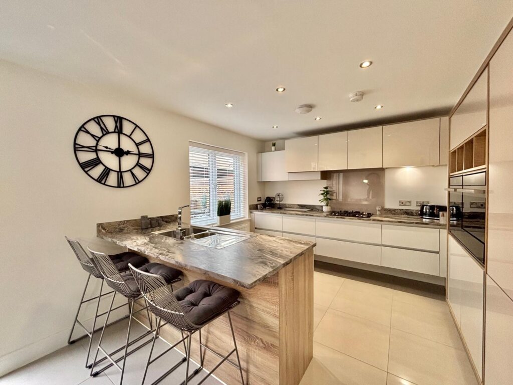 Fitted with a range of wall and base units in a white finish with coordinating work surfaces, integrated double oven, four ring gas hob, extractor fan, kitchen island with one and a half bowl single drainer sink with mixer tap, UPVC double glazed window to the rear, UPVC doors to the rear, access to the utility room, radiator, power and ceiling light points.