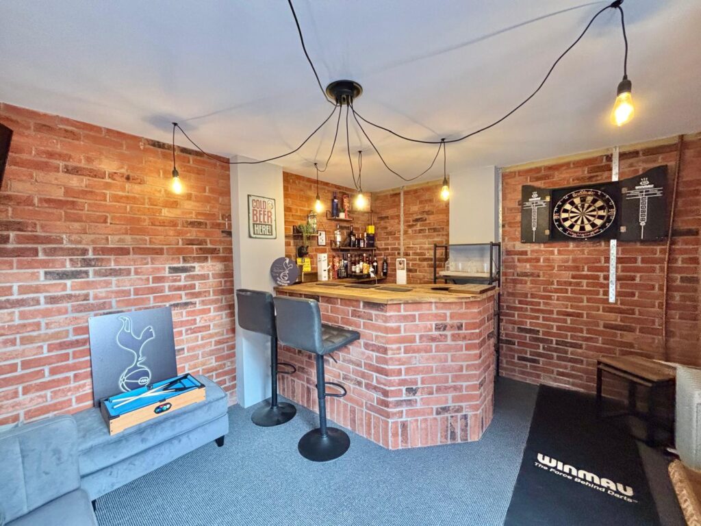 The garage is detached from the property and has been turned into a bar with power and lighting.