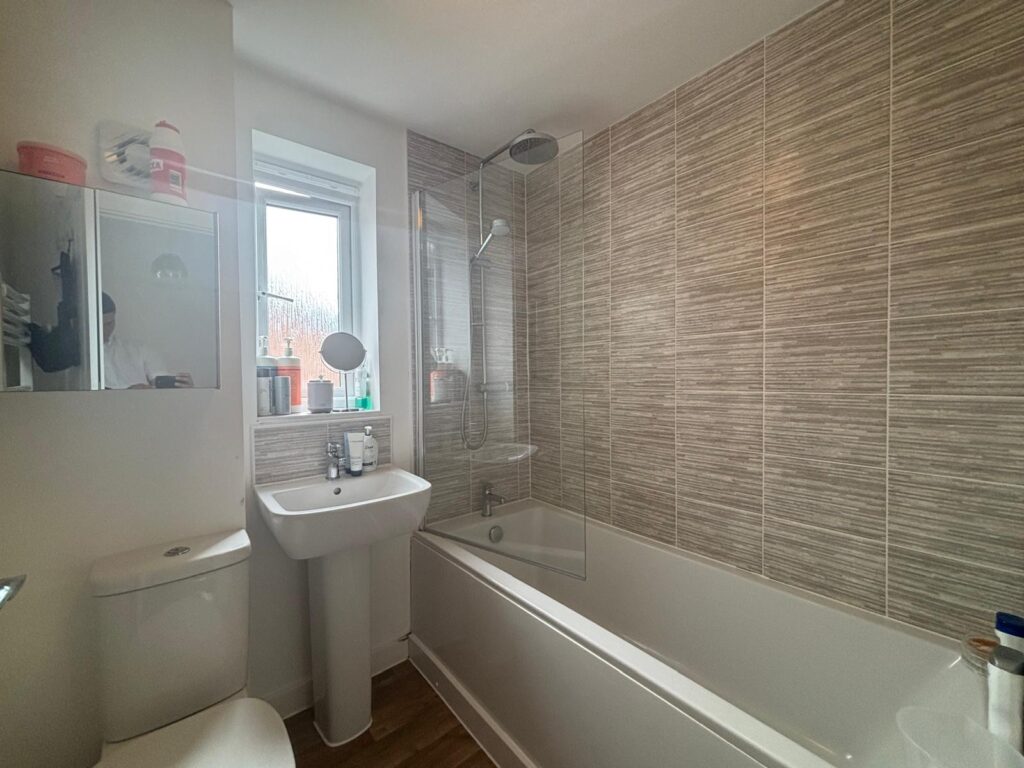 Fitted with a suite in white comprising low level WC, pedestal wash hand basin and panelled bath with shower over. With an opaque window to the side elevation and a central heating radiator.