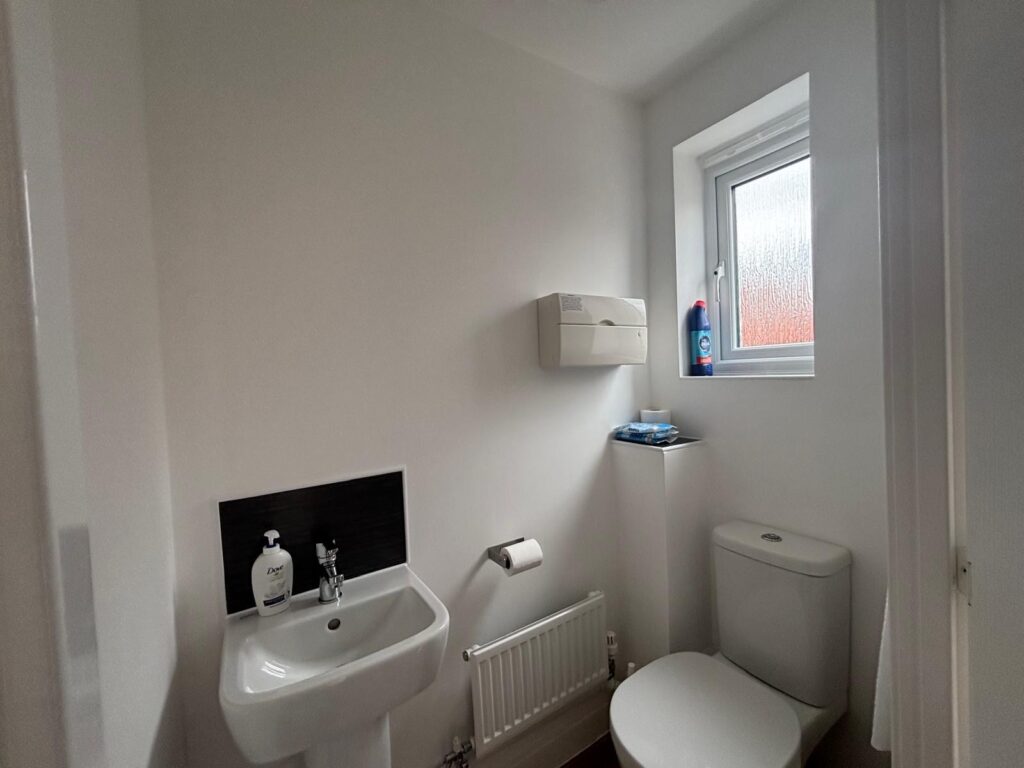Fitted with two piece suite comprising low level WC and pedestal wash hand basin. With an opaque window to the front elevation and a central heating radiator.