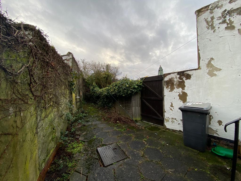 Fitted with a range of wooden wall and base units, part wall panelling with various shelving units, single drainer sink with mixer tap, oven and four ring induction hob but extractor fan over, integrated fridge-freezer, windows to the rear and side, door to the rear, radiator, two ceiling light points and power points.