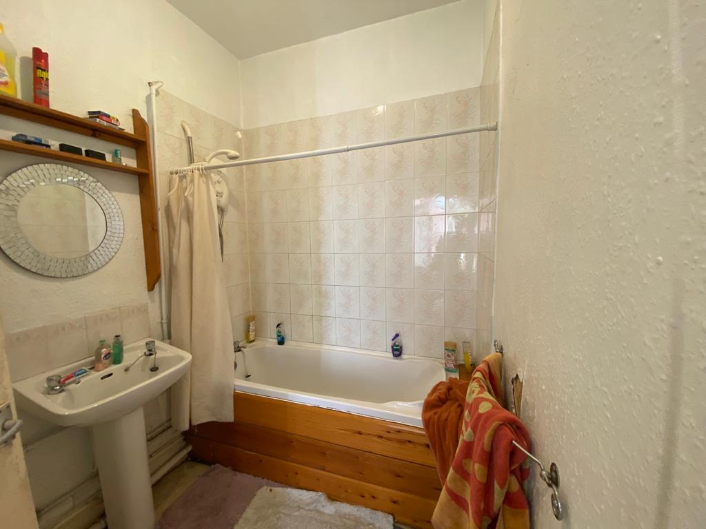 Fitted with a three piece white suite comprising W.C, pedestal wash hand basin with splash back tiling, bath and shower over with matching tiles, opaque window, radiator and ceiling light point.