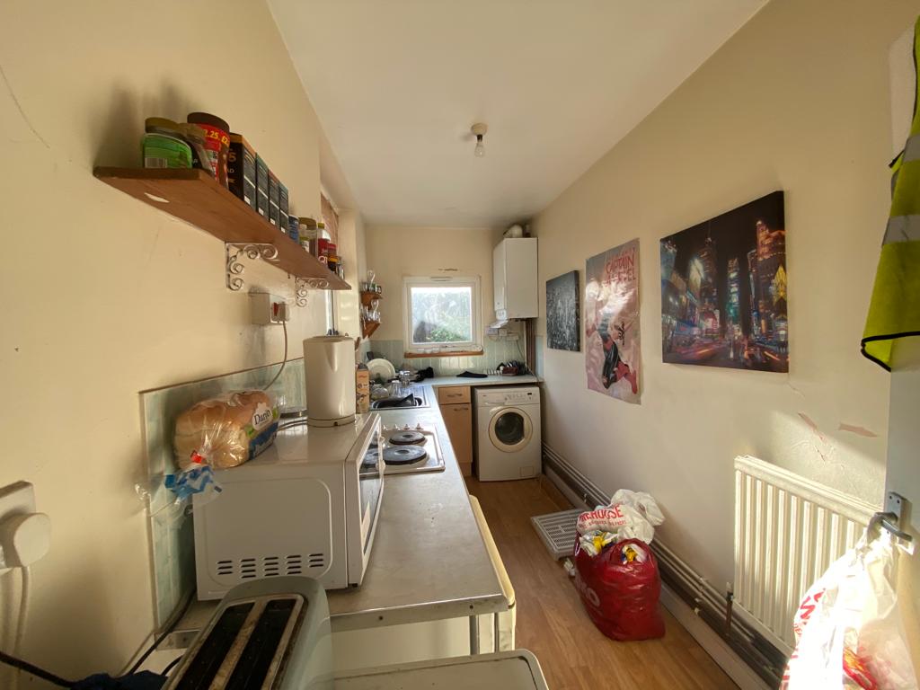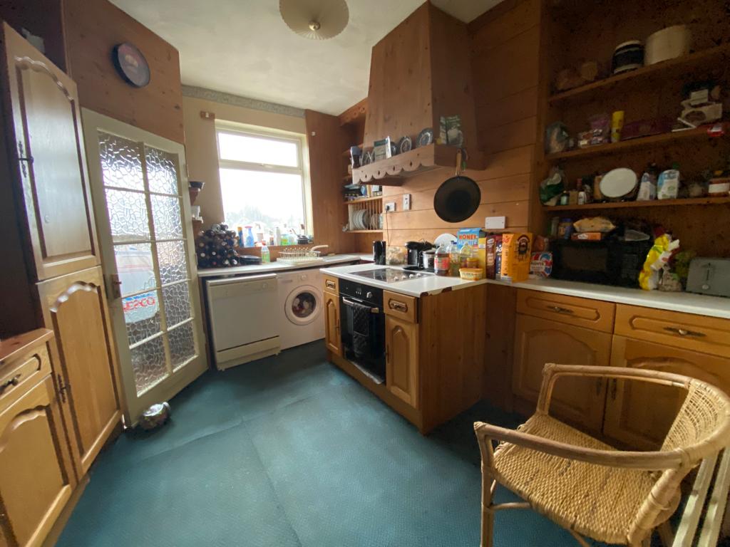 Fitted with a range of base units in a wooden effect finish, roll top work surface with coordinating splash back tiling, oven and four ring hob, single drainer stainless steel sink, windows to the side and rear, radiator, ceiling light point and power points.