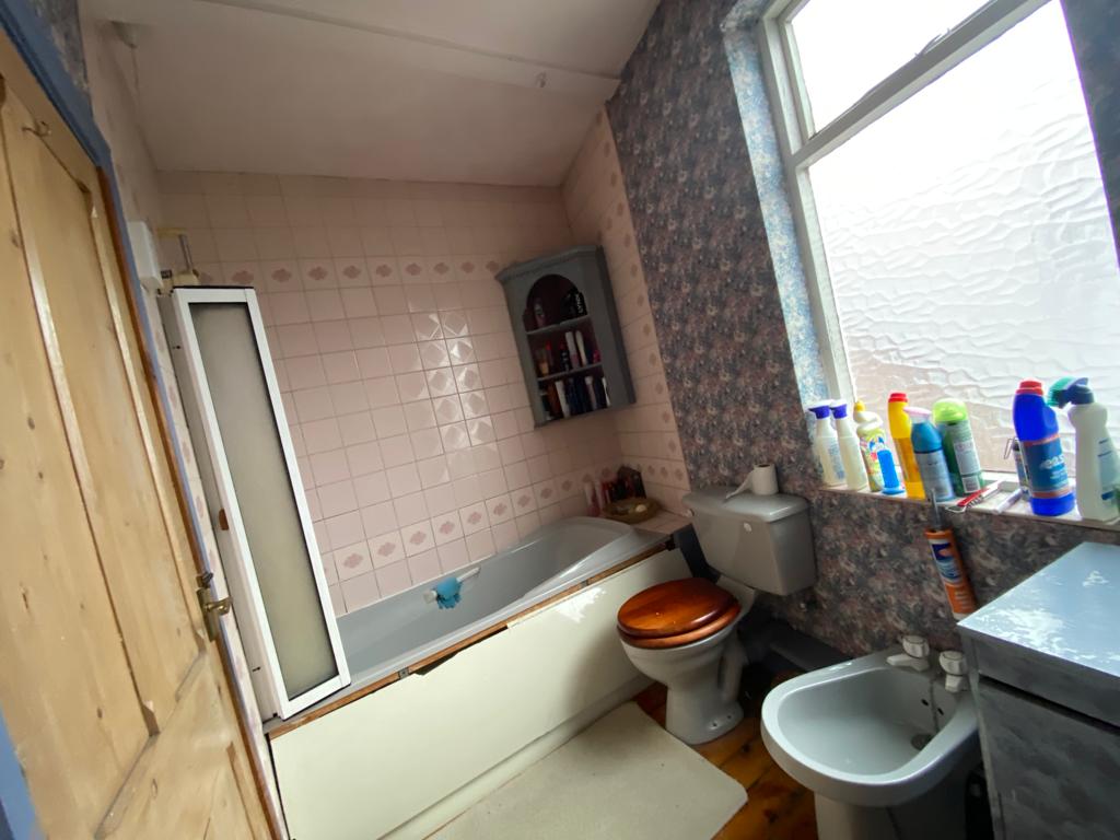 Fitted with a three piece suite comprising W.C, wash hand basin, bath and shower over with wall tiling, bidet, opaque window, radiator and ceiling light point.