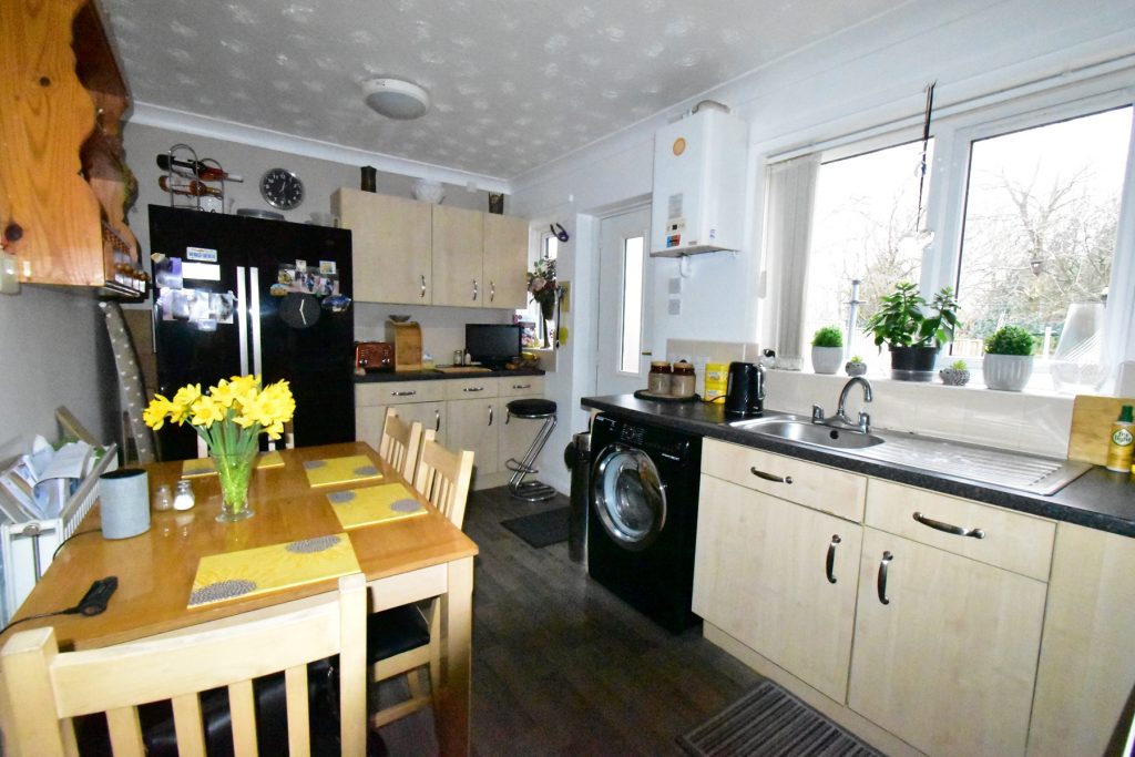 Fitted with a range of wall and base units in a light wood effect finish with coordinating work surfaces, part wall tiling, space and plumbing for a fridge freezer, space and plumbing for a washing machine, space and fittings for an oven, single drainer sink with mixer taps, window to the rear, door to the rear, radiator, power and ceiling light points.