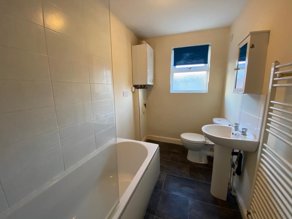 White three piece suite comprising of a bath with shower over, W.C. and wash hand basin, opaque window, radiator, power and ceiling light point.