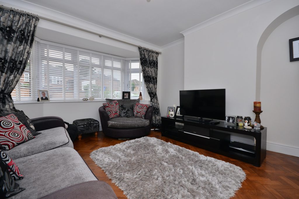 Bay fronted lounge with UPVC double glazed bay window to the front, deep skirting boards, power points, television aerial point, ceiling coving, ceiling light point with dimmer switch, thermostatically controlled radiator and continuation of parquet flooring.