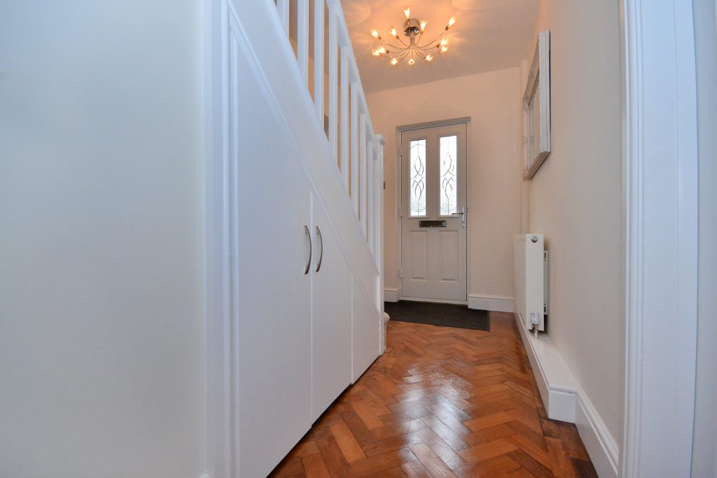 The impressive hallway provides a warm welcome and has parquet flooring, deep skirting boards, thermostatically controlled radiator and stairs to the first-floor landing with understairs storage cupboard.